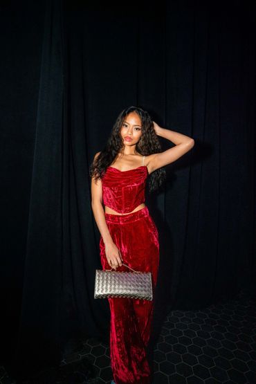 Woman in dark cargo pants and crop top leaning against a light post at night.